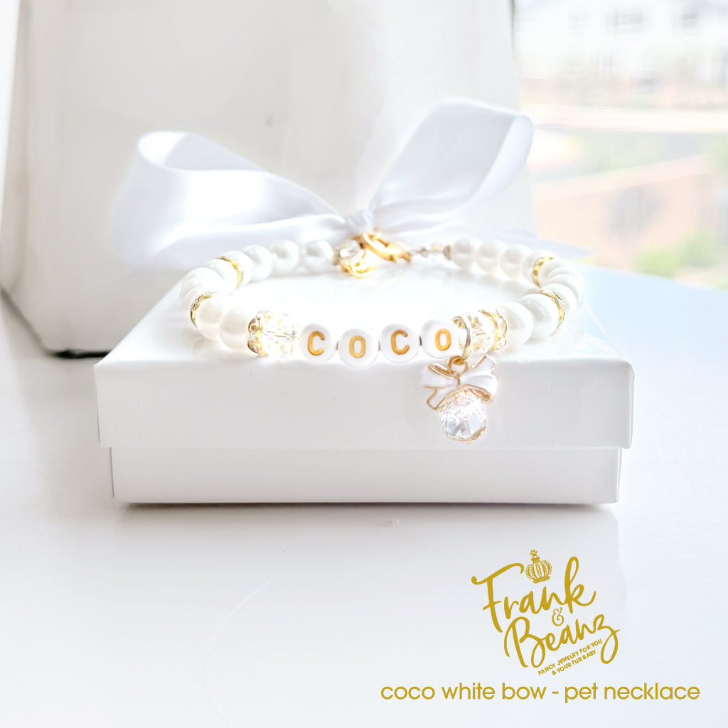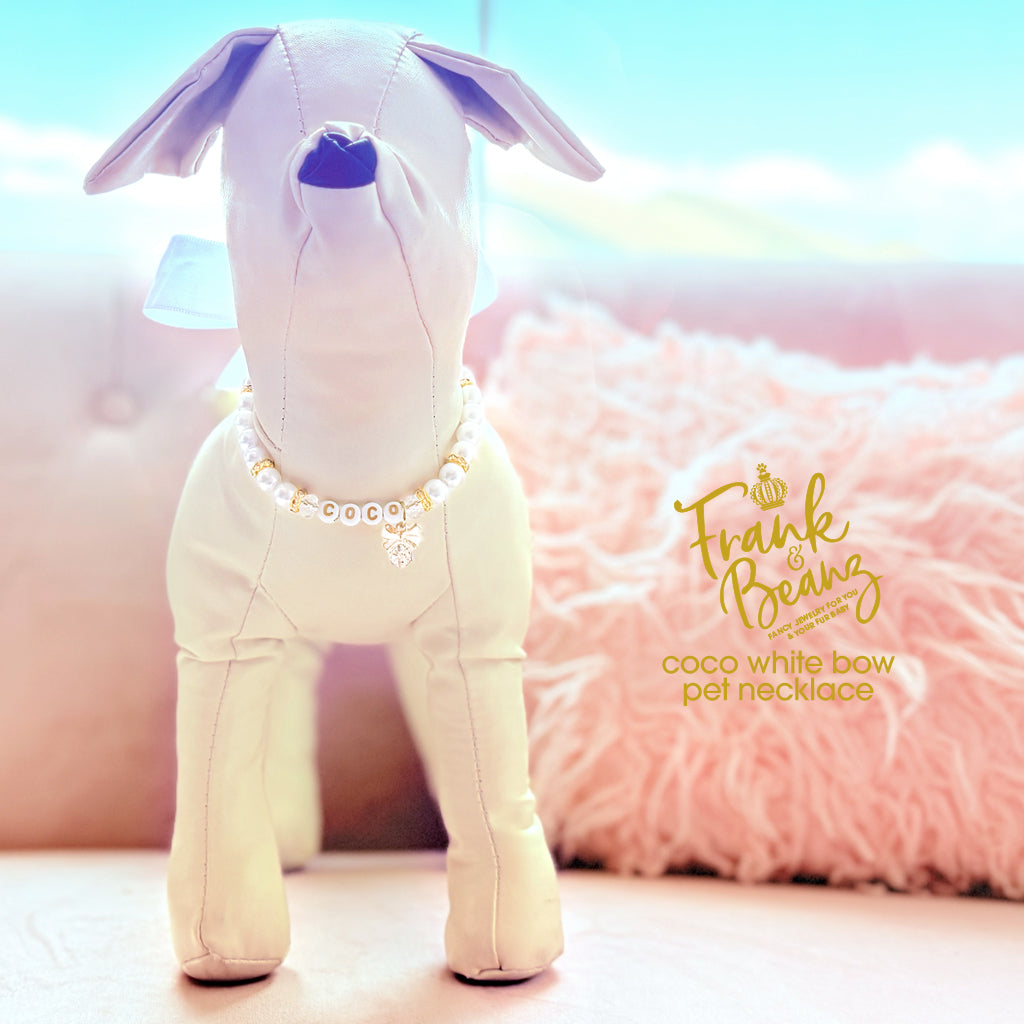 White Bow Crystal Gem Pet necklace is handmade with white pearl beads that are lightweight so it sits comfortably on your fur baby's neckline.